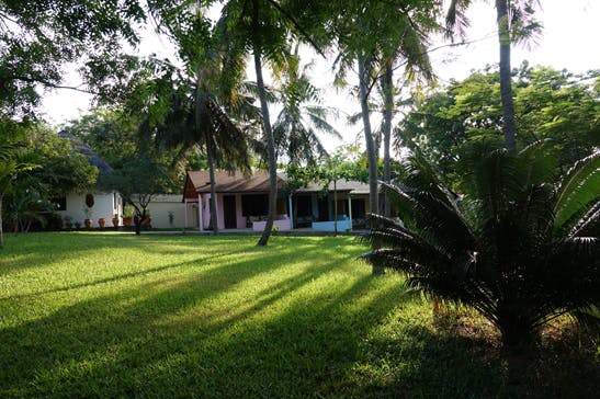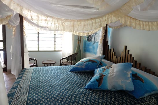 The double bed has a box spring mattress and a beautiful mosquito net. There is a wandrobe, a large desk and a refrigerator. All furniture in the villas and suites is handmade by our carpenter. He works on our plot and has received many inspirations from us to conjure up modern, timeless great furniture. This wood "Mwule" comes from East Africa, is quite dense and heavy and is of great durability.